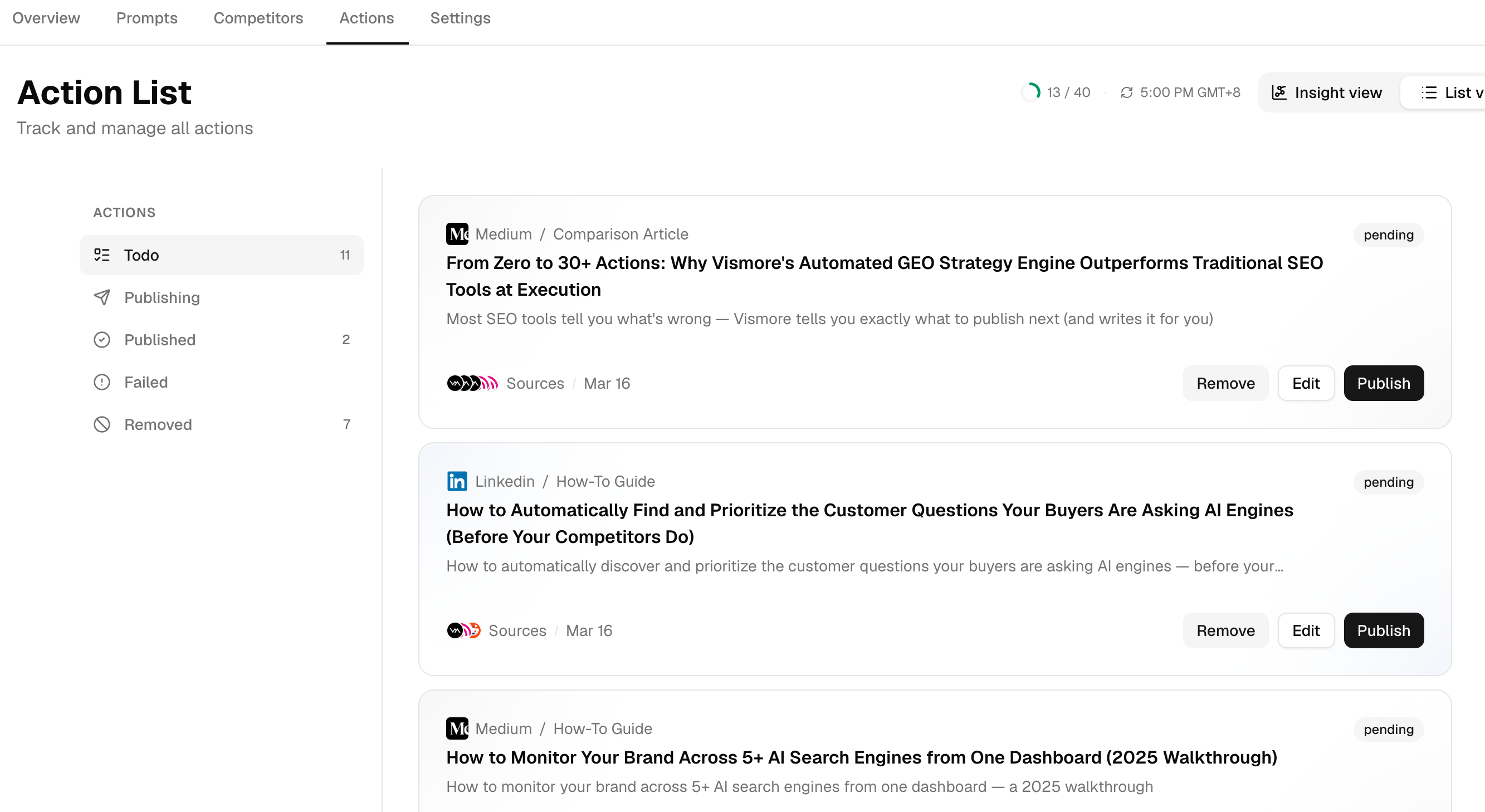 The second is need for execution capability. Monitoring without execution is observation without leverage. If your team needs to move from "we know what is wrong" to "we fixed it" within the same workflow, only Vismore supports that loop. Profound and Otterly AI require you to act on insights using separate tools.